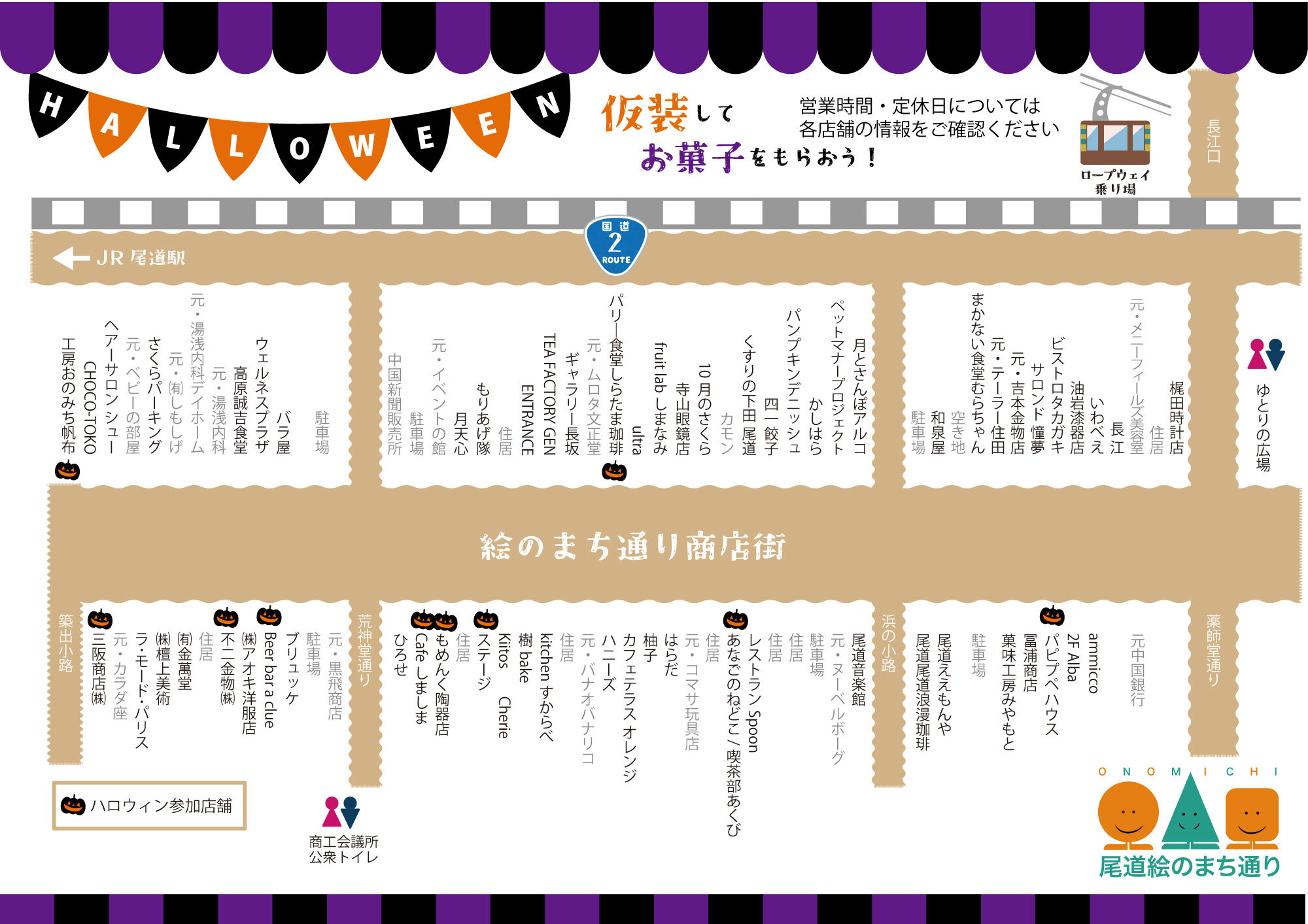 ハロウィンまでの一週間、絵のまち通りの店舗に仮装して行って「トリックオアトリート!」と言うとお菓子が貰えます🥳 ちょっとした仮装でもOK(帽子、フード、めがね、ボディペイントなど) 仮装して絵のまち通りに是非遊びに来てくださいね🎉 団体で来られる場合は、予めご連絡ください。 【参加店舗】 Cafeしましま(木金定休日) もめんく陶器店(木定休日) パリー食堂しらたまcoffee(月金定休日) 工房尾道帆布(木定休日) 三阪商店(木定休日) Beer Bar a clue(夜営業、木定休日) 喫茶部あくび(不定休) パピプペハウス(火水木定休日) ステージ(不定休) 不二金物(日定休日) |
