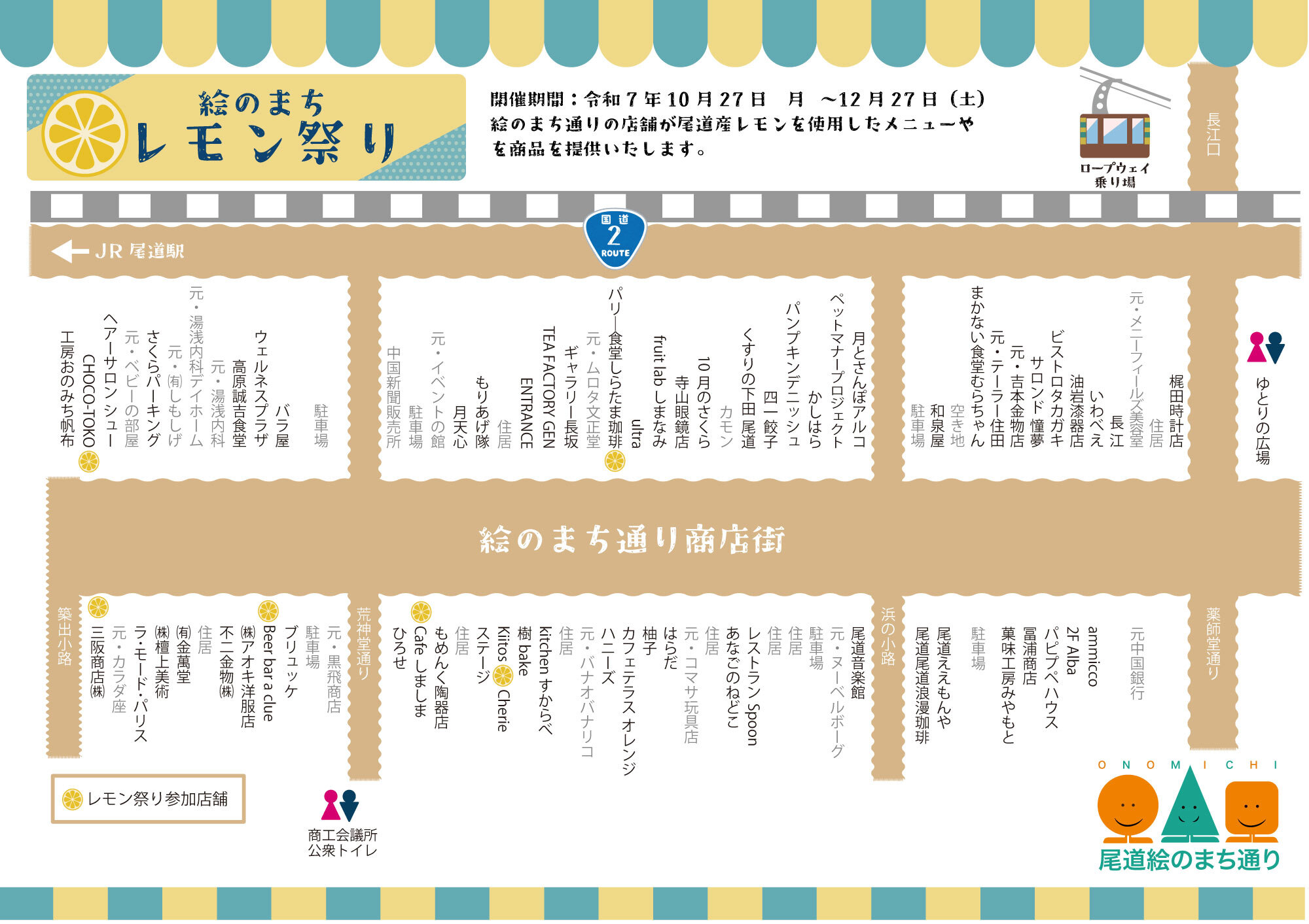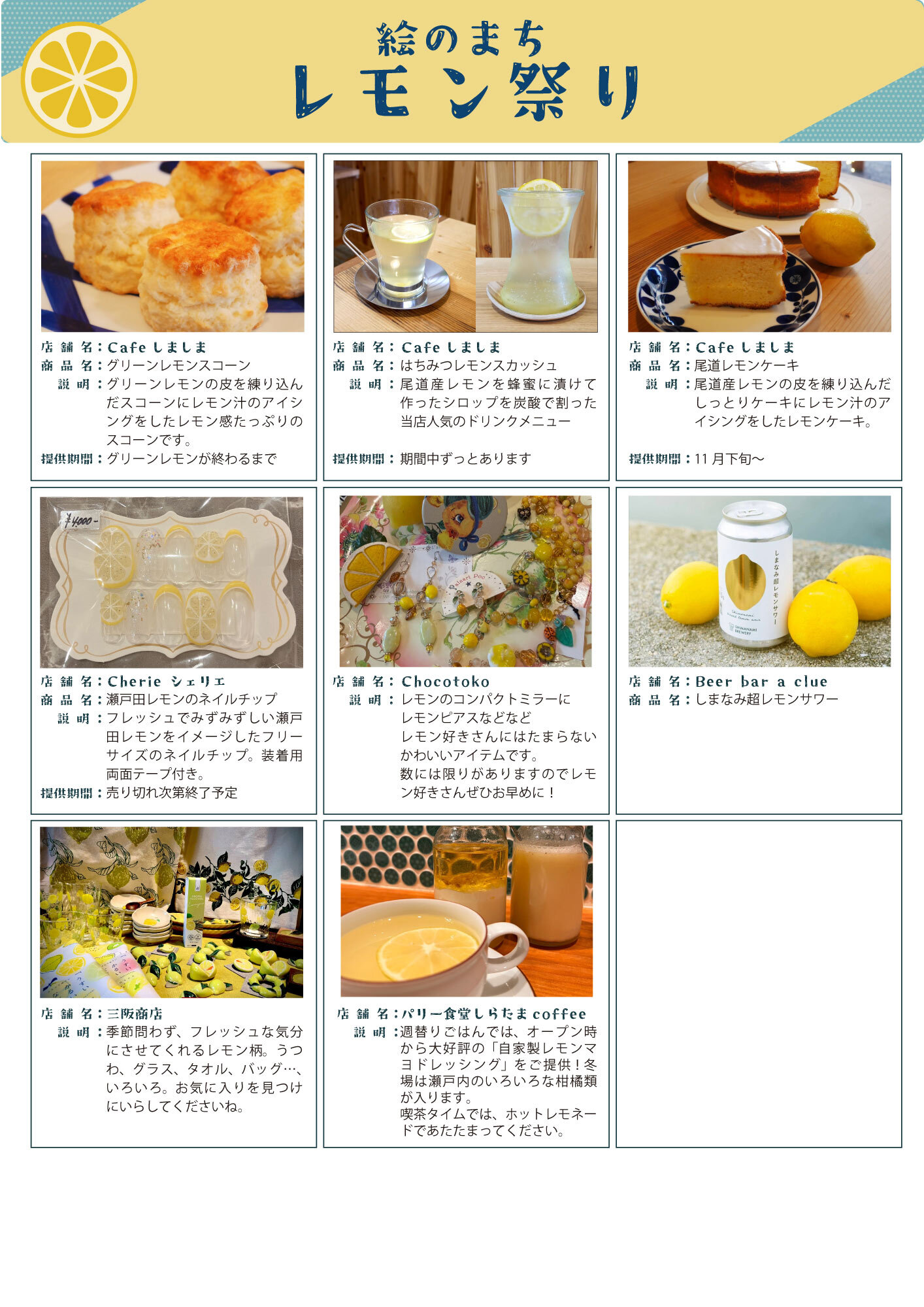イベント 店舗トピックス 本通りニュース 戻る 2025/10/21 更新 絵のまち通りイベント レモン祭り 尾道レモンの魅力を発信するため、絵のまち通り商店街のレモン商品をご紹介! 開催日 令和7年10月27日(月)〜12月27日(土) 開催場所 絵のまち通り商店街店舗 イベント内容 絵のまち通りの店舗が尾道産レモンを使用したメニューや、レモンモチーフの商品を提供いたします。メニューは随時HPや絵のまち通りのSNSでお知らせいたします。 商店街のページへ ホーム 本通りニュース 絵のまち通り レモン祭り