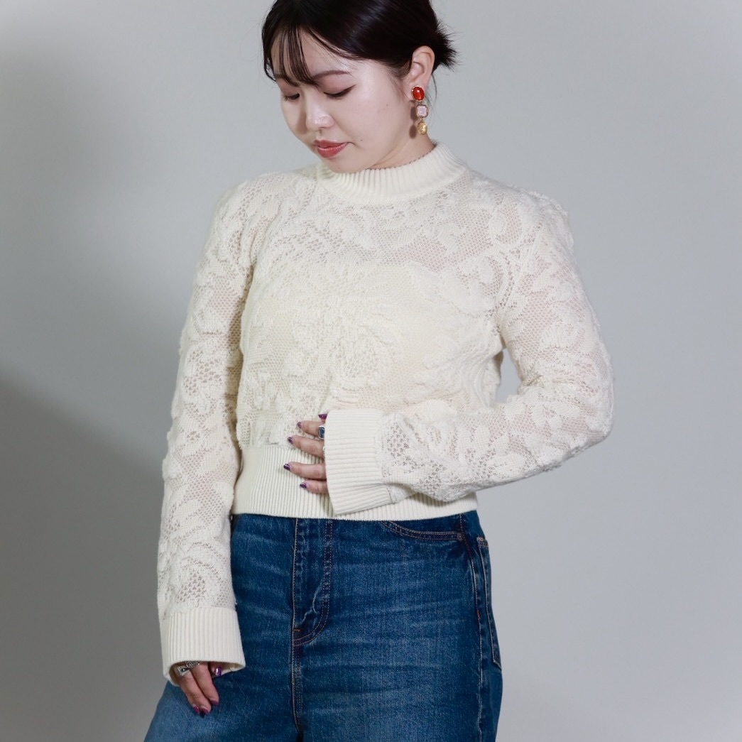 PHOTOCOPIEU(フォトコピュー)のニット。ヴィンテージレースの柄をジャカード編みで落とし込んだ、フェミニンかつ芯のある佇まいが印象的なセーター。繊細なレース模様に対し、袖山に高さをもたせることで、肩にシャープなラインを生み出し、甘さと強さが共存する絶妙なバランスを演出しています。クラシカルなレースパターンと、モダンな立体シルエットが融合することで、ただ優しいだけではない、“意思ある女性像”を表現するデザインに。1枚で着映えしながらも、パンツ・スカート問わず様々なボトムと調和し、日常のスタイリングに凛とした空気を加えてくれる一着です。