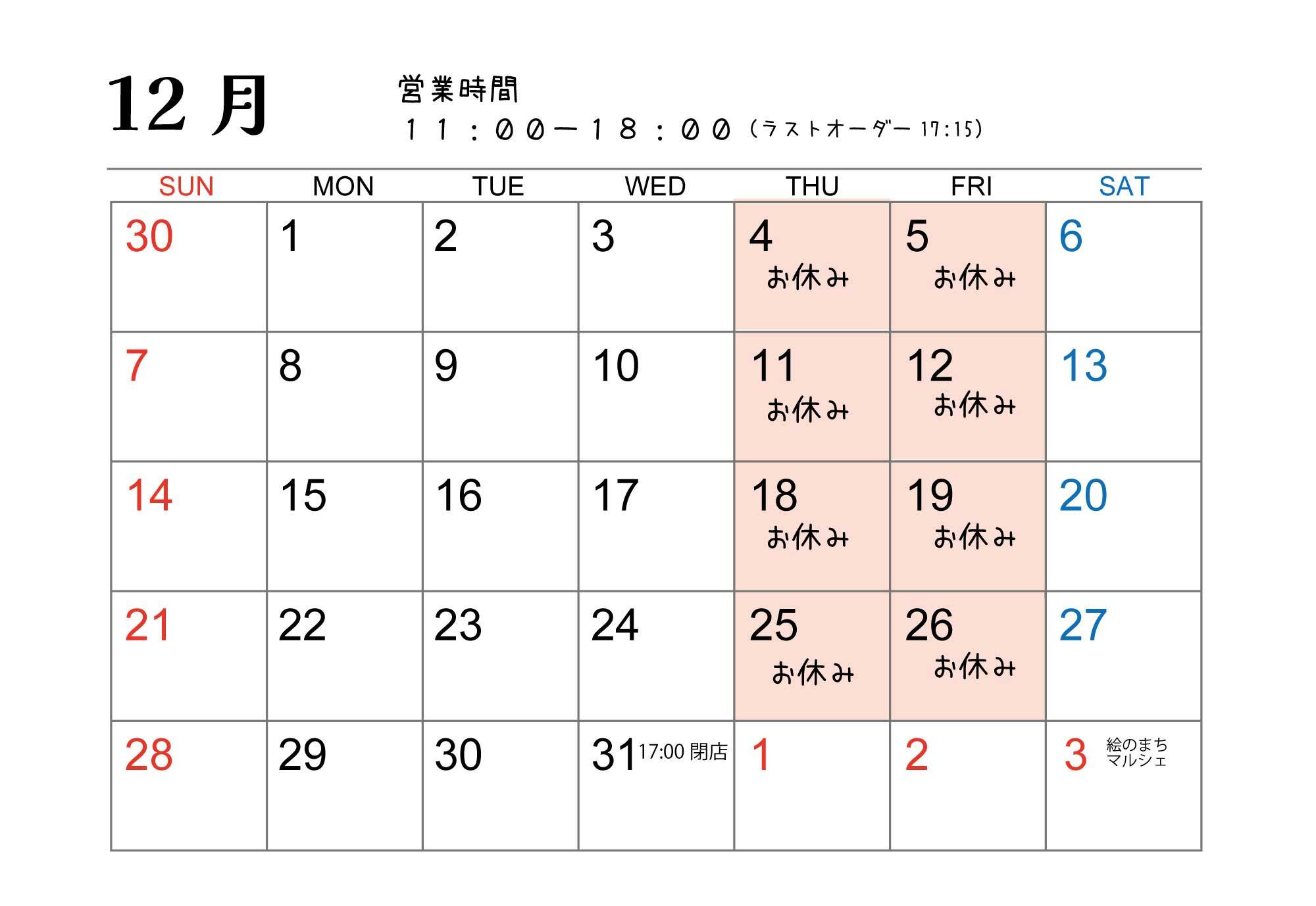 トピックス 店舗トピックス 本通りニュース 戻る 2025/12/01 更新 cafeしましまニュース 12月カレンダー 12月カレンダーです。通常どおり木金曜日休みです。年末年始は休まず営業します。12/31大晦日のみ17:00閉店です。毎年恒例の1/2、3の絵のまちマルシェ(ゆとりの広場)は、来年は1/3のみ出店予定です。 店舗ページへ ホーム 店舗トピックス cafeしましま 12月カレンダー