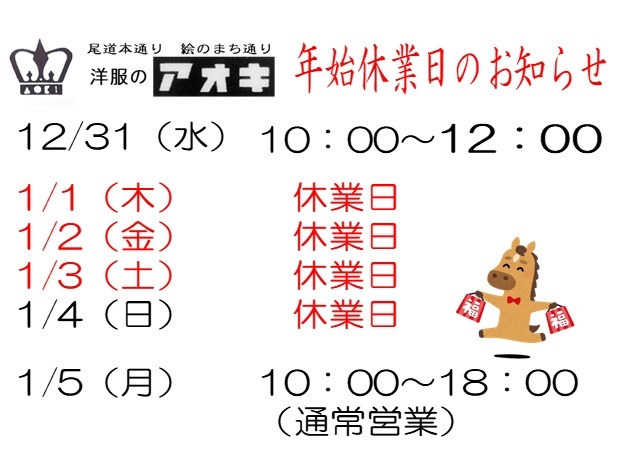 トピックス 店舗トピックス 本通りニュース 戻る 2025/12/27 更新 アオキ洋服店ニュース 年末年始営業予定について 年末年始の営業予定12月30日(火)まで 通常営業(10:00~18:00)12月31日(水) 10:00~12:00(お昼までの営業です)年が変わって1月1日(木)~1月4日(日) 休業1月5日(月)~ 通常営業(10:00~18:00)よろしくお願いいたします。 店舗ページへ ホーム 店舗トピックス アオキ洋服店 年末年始営業予定について