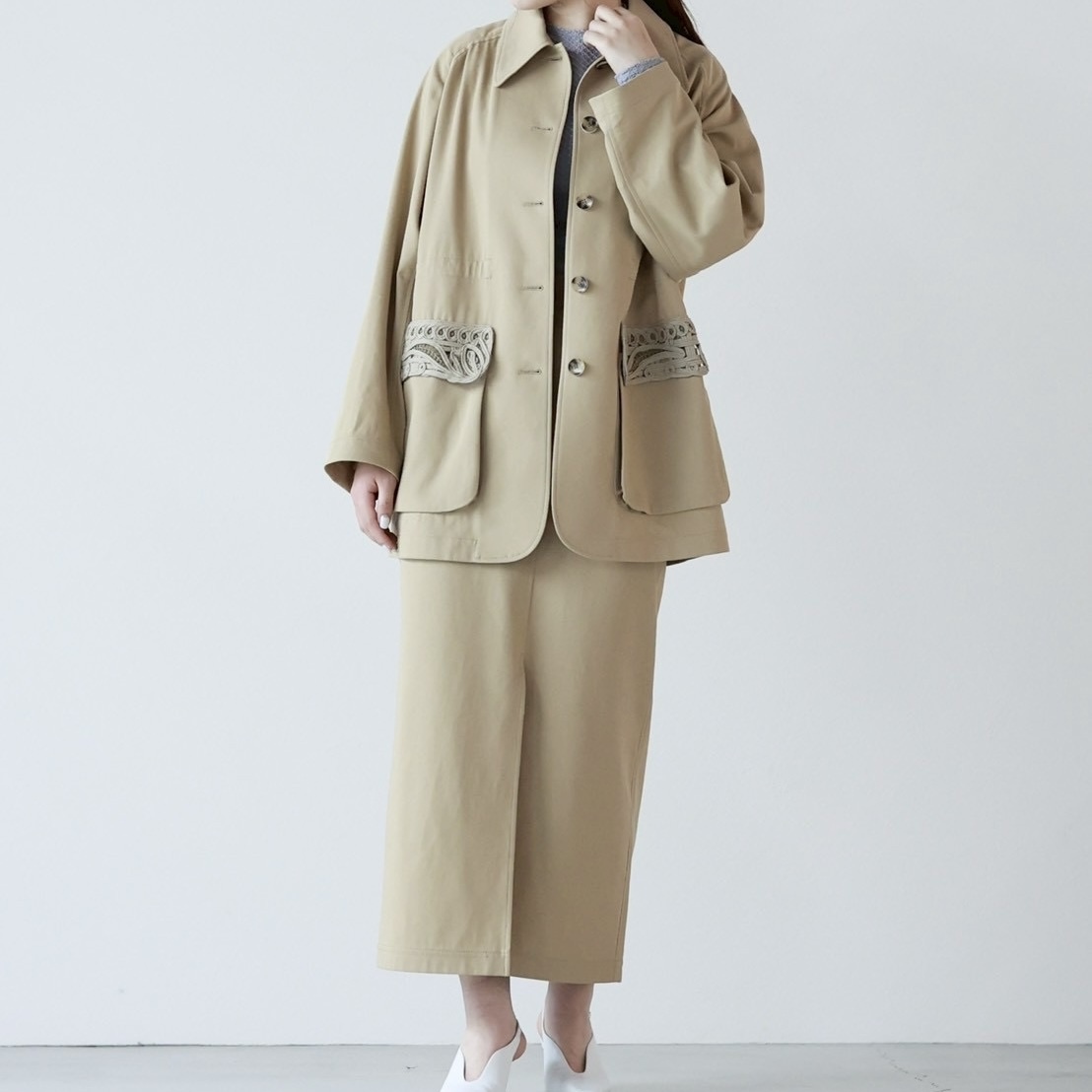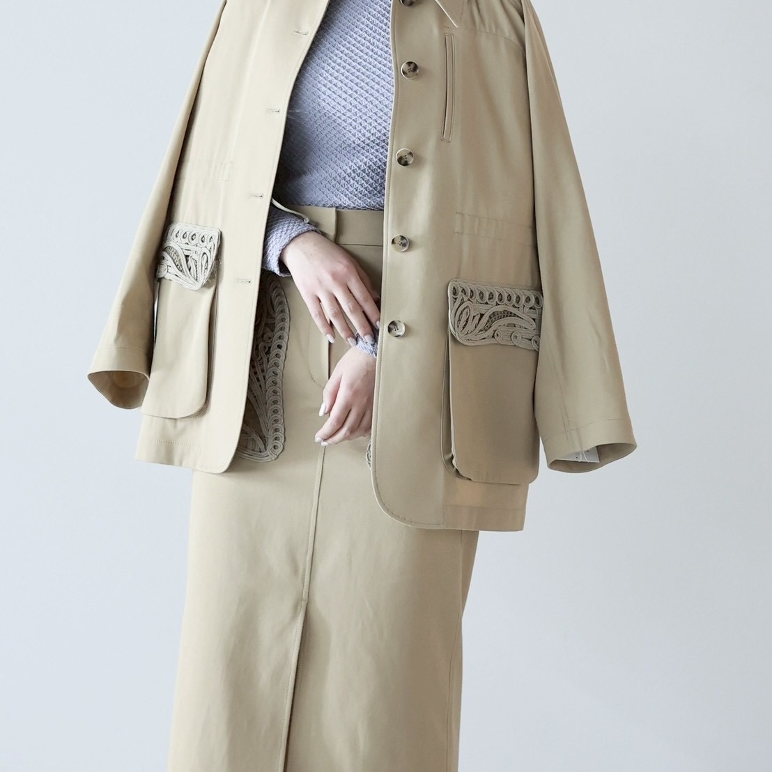 Mame Kurogouchi(マメ クロゴウチ)のジャケット。アイコニックなコード刺繍を施したフラップが印象的な、ミドルレングスのジャケット。オーバーサイズのシルエットでありながら、ウエストに配した紐を調整することで、表情に変化をつけた着こなしが可能です。装飾性のあるディテールを取り入れつつも、全体はすっきりとしたバランスに仕上げ、上品で洗練された印象に。日常のスタイリングに自然に馴染む、汎用性の高い一着です。