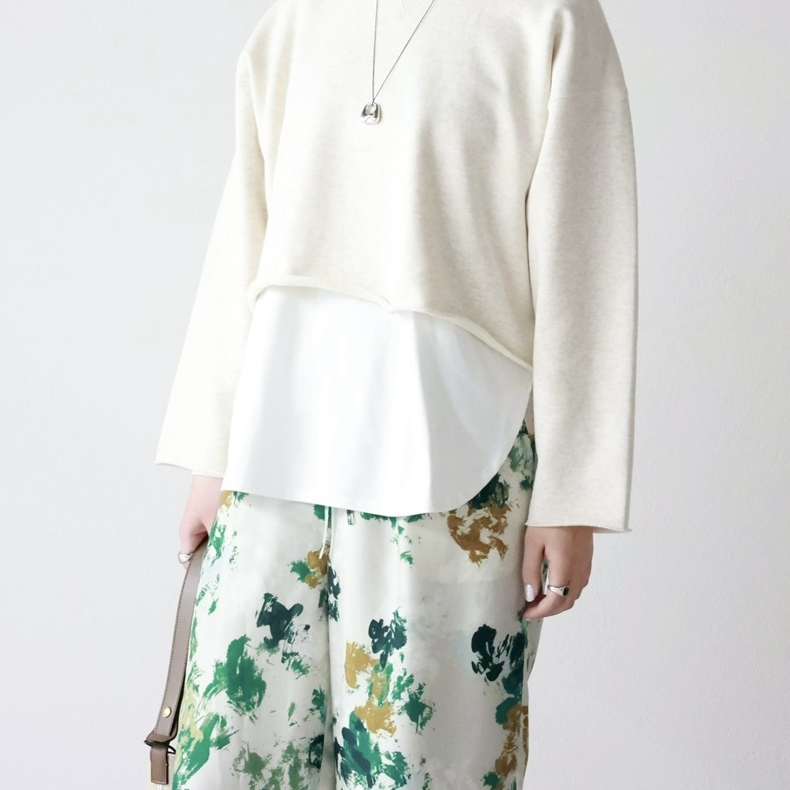 SACRA(サクラ)のスウェット。上質な裏毛素材を使用した、クリーンで洗練された印象のスウェットトップスです。クロップド丈と長めに設計されたスリーブのコントラストが、シンプルながらも今の気分にフィットするバランス感を演出。カジュアルなアイテムでありながら、女性らしい抜け感とモードな雰囲気を兼ね備えています。袖口と裾は裁ち切り仕様にすることで、程よいラフさをプラス。デニムやワイドパンツと合わせたデイリーコーデはもちろん、きれいめスカートと合わせたミックススタイルもおすすめです。短丈のため、ハイウエストボトムと好相性でスタイルアップ効果も期待できます。