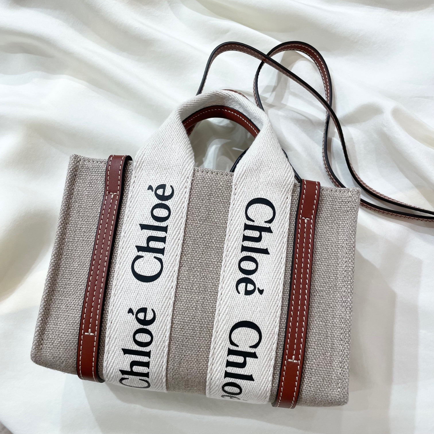 Chloe(クロエ)のミニトートバッグ。リネンキャンバスにシャイニーカーフスキンの飾り紐をあしらったWoodyミニトートバッグ。力強い夏のムードを放つ、昼夜を問わず活躍するコンパクトなバッグです。メインコンパートメントは携帯電話に対応しています。コントラストな縦のレザーの飾り紐とメゾンのWoodyミュールと合わせたシグネチャー、Chloeロゴのリボンが、バッグのシャープでモダンなラインを際立たせています。ハンドキャリー、ロングショルダー、クロスボディでお持ち頂けます。