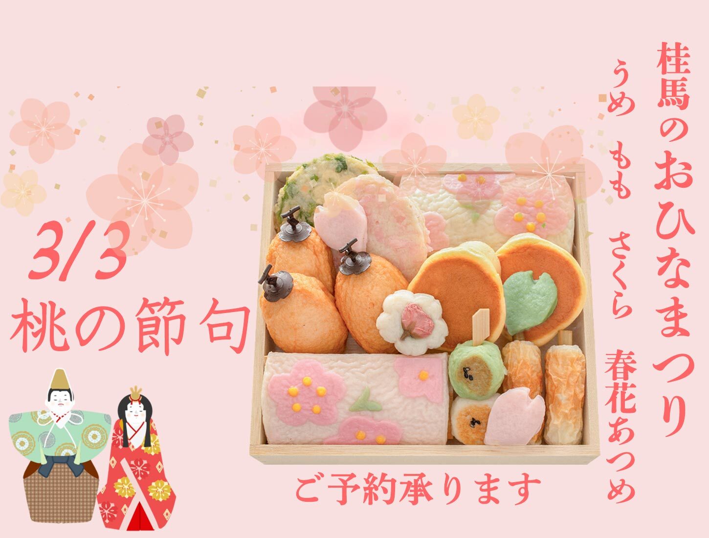 トピックス 店舗トピックス 本通りニュース 戻る 2026/02/16 更新 桂馬蒲鉾商店ニュース おひなまつりに桂馬の蒲鉾 3月3日はおひな祭り 桂馬のおひなまつり 桃の節句にちなんで桃花の飾り板や春らしい桜の花びら、桜しんじょなどをお詰合せしたお品をご用意いたしております。桃の節句のお祝いに桂馬の春蒲鉾はいかがでしょうか。 春のまごころ二段重ね うめ もも さくら春花あつめ 桜の花かご 春の尾道 さくらかご 店舗ページへ ホーム 店舗トピックス 桂馬蒲鉾商店 おひなまつりに桂馬の蒲鉾