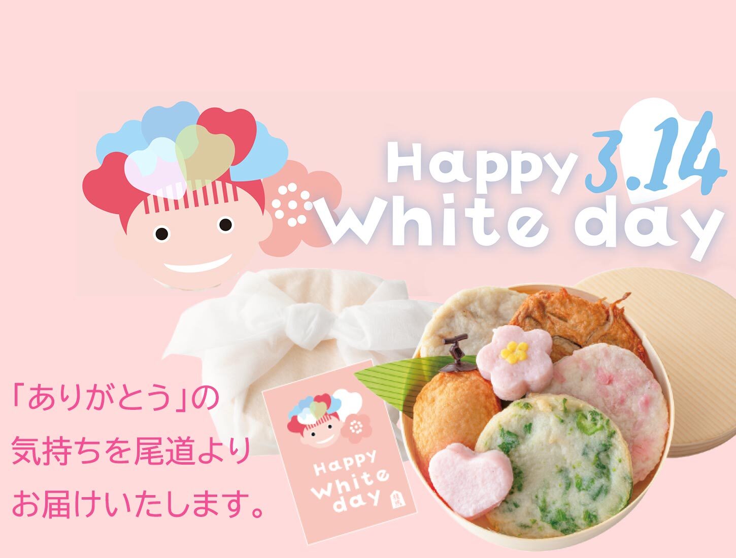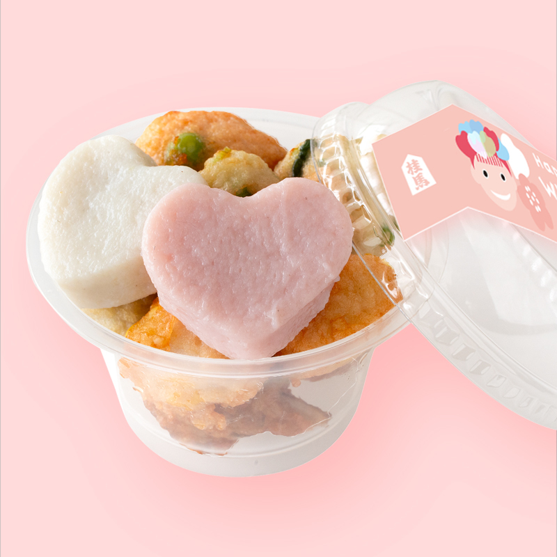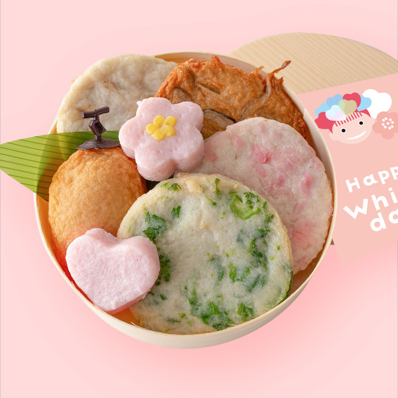 定番のお品と春限定の桜もち天、菜の花天、ハートのひと口蒲鉾、紅梅かまぼこを丸折箱にかわいらしくお詰めしました。