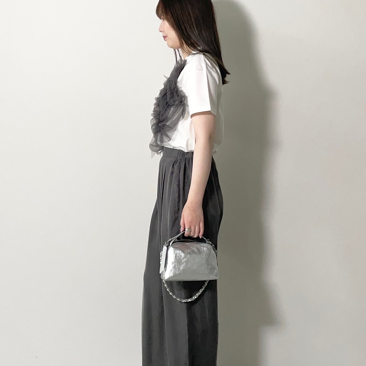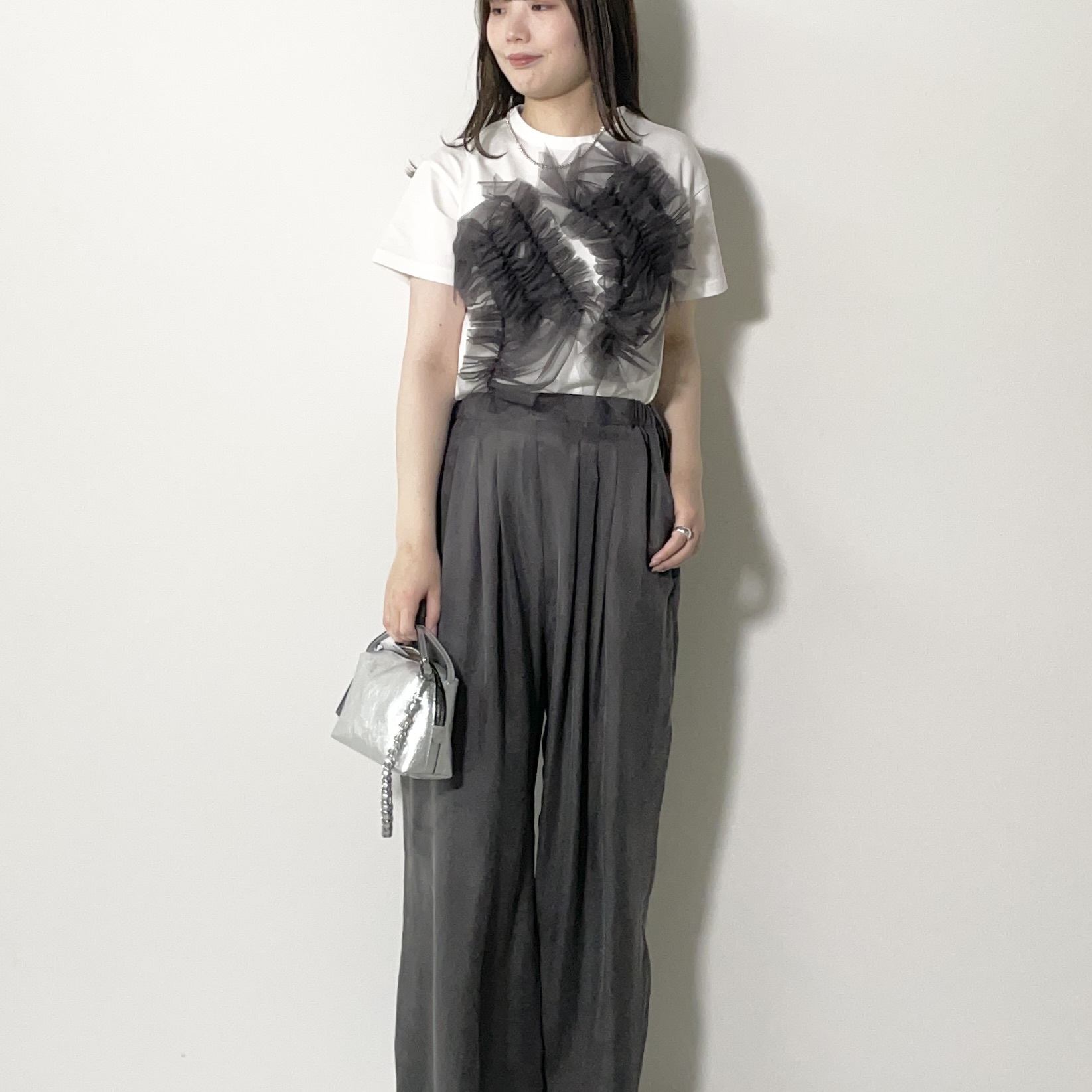 Chika Kisada(チカキサダ)のフロントにあしらったチュールフリルが印象的なTシャツ。25SSシーズンに展開されていたインラインモデルをベースに、PARIGOT別注として展開した特別カラー。チュールの配色にもこだわり、ホワイトにはグレーのチュール、ブラックにはベージュのチュールを組み合わせ、より洗練された印象を引き立てます。