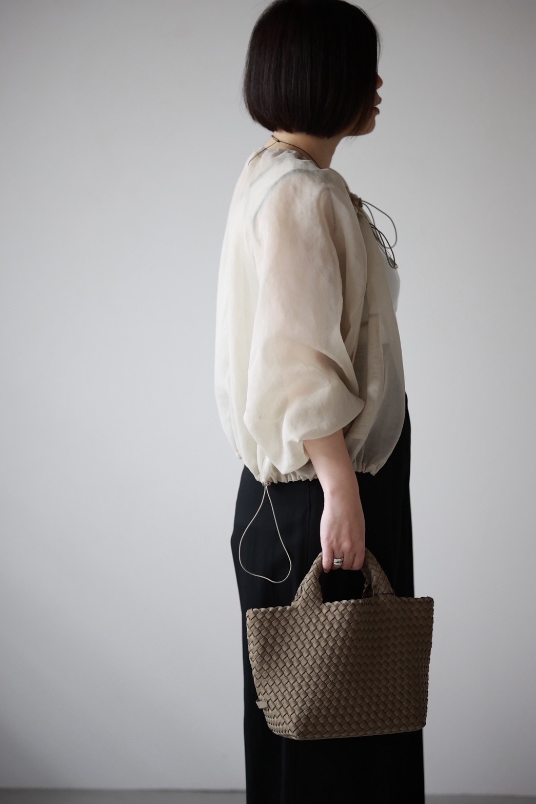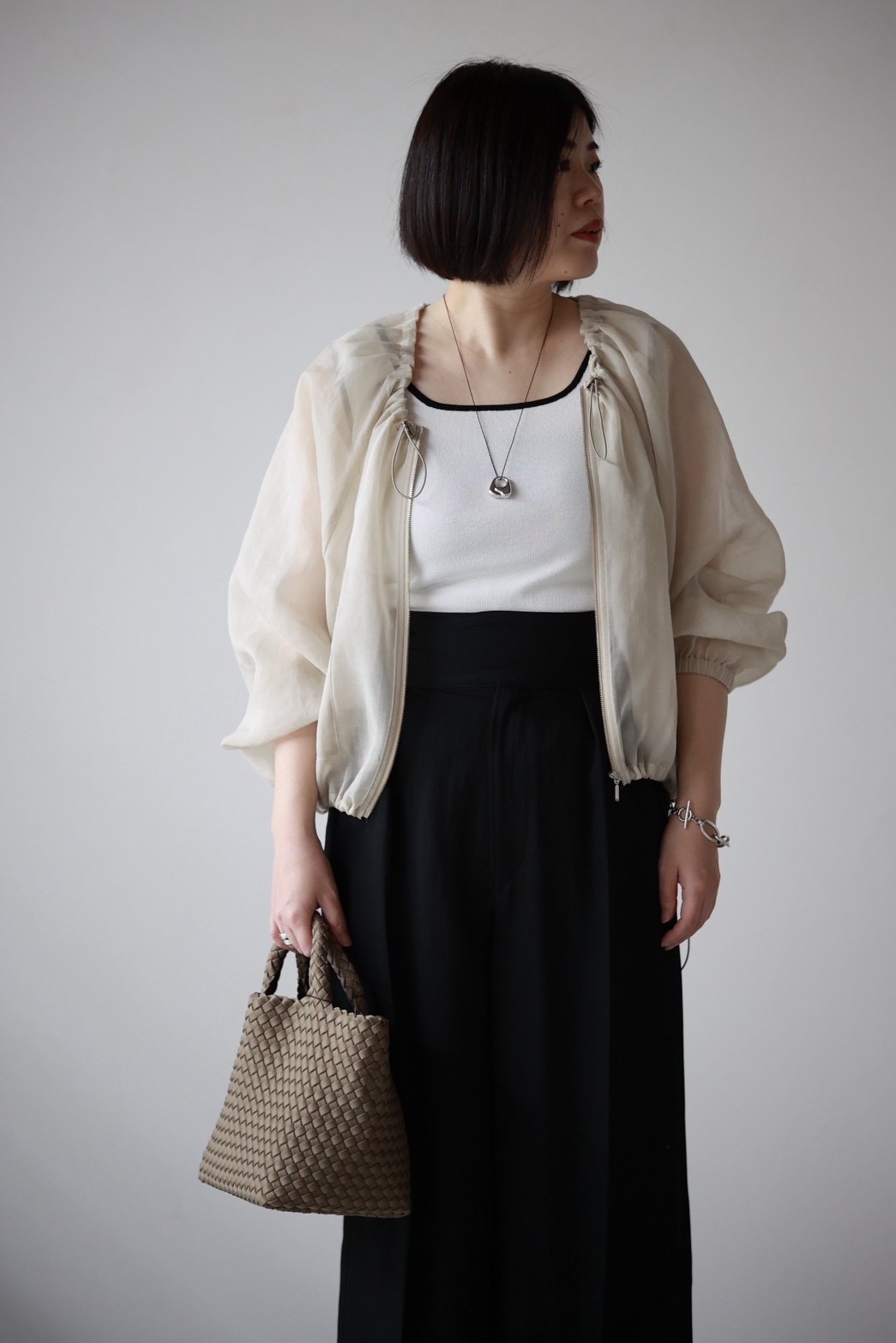 シャツ感覚で羽織れるシアーブルゾン。軽やかなオーガンジー素材に、ギャザーを寄せた丸みのあるフォルムが特徴的で、動きに合わせて柔らかく揺れます。透け感のある素材が春夏にぴったりの涼しげな印象を与え、ネックラインや裾にはドローストリングをあしらい、スポーティーなニュアンスをプラス。かっちりしすぎずラフに羽織れるので、カジュアルに着こなしたい方におすすめです。トレンドのドロスト使いを取り入れ、今季らしいアイテムに仕上げました。