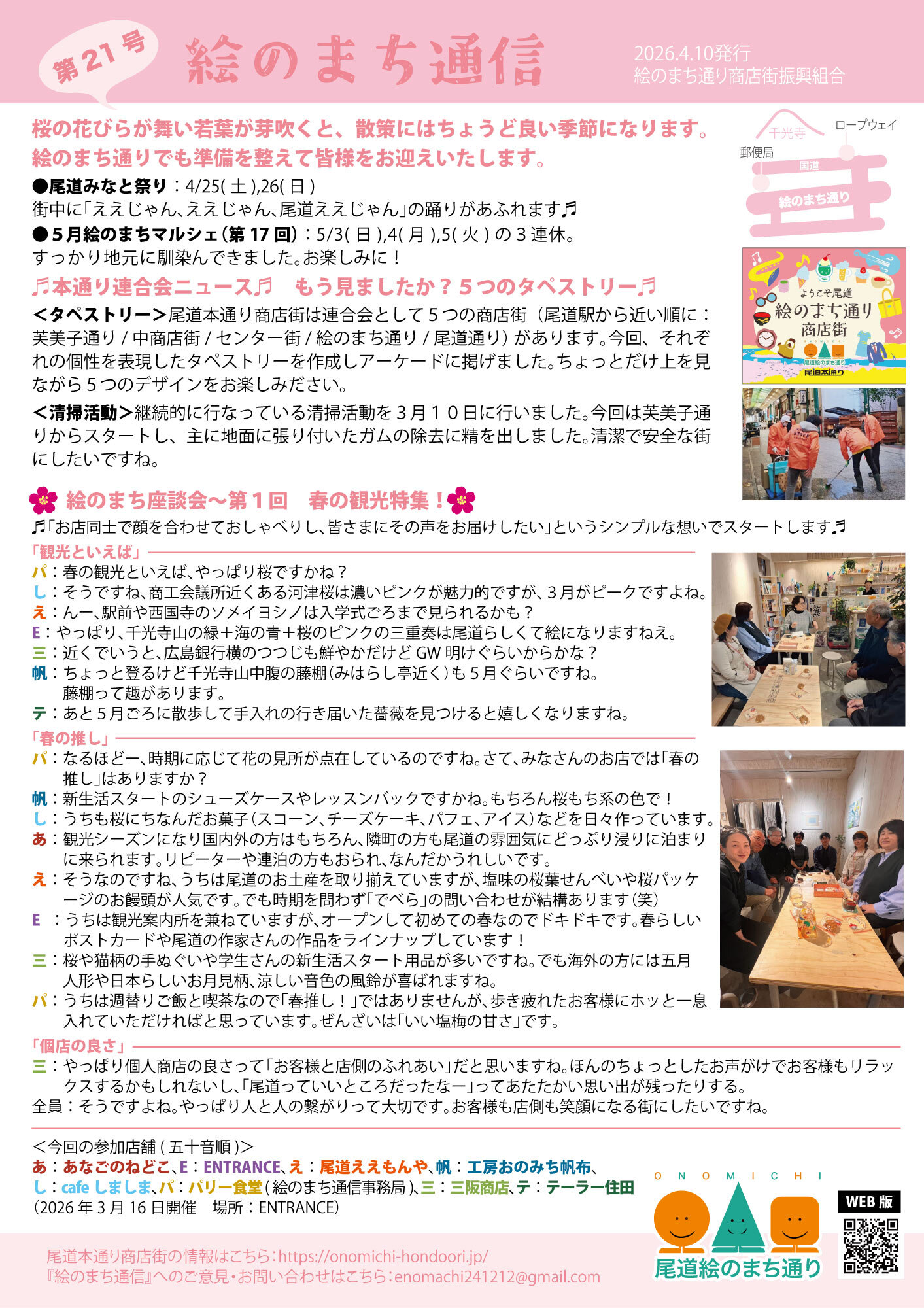 トピックス 店舗トピックス 本通りニュース 戻る 2026/04/10 更新 絵のまち通りニュース 絵のまち通信21号 絵のまち通信21号ができました。ご一読ください。絵のまち通信21号(PDF) 商店街のページへ ホーム 本通りニュース 絵のまち通り 絵のまち通信21号